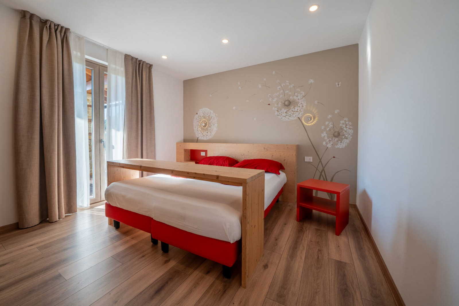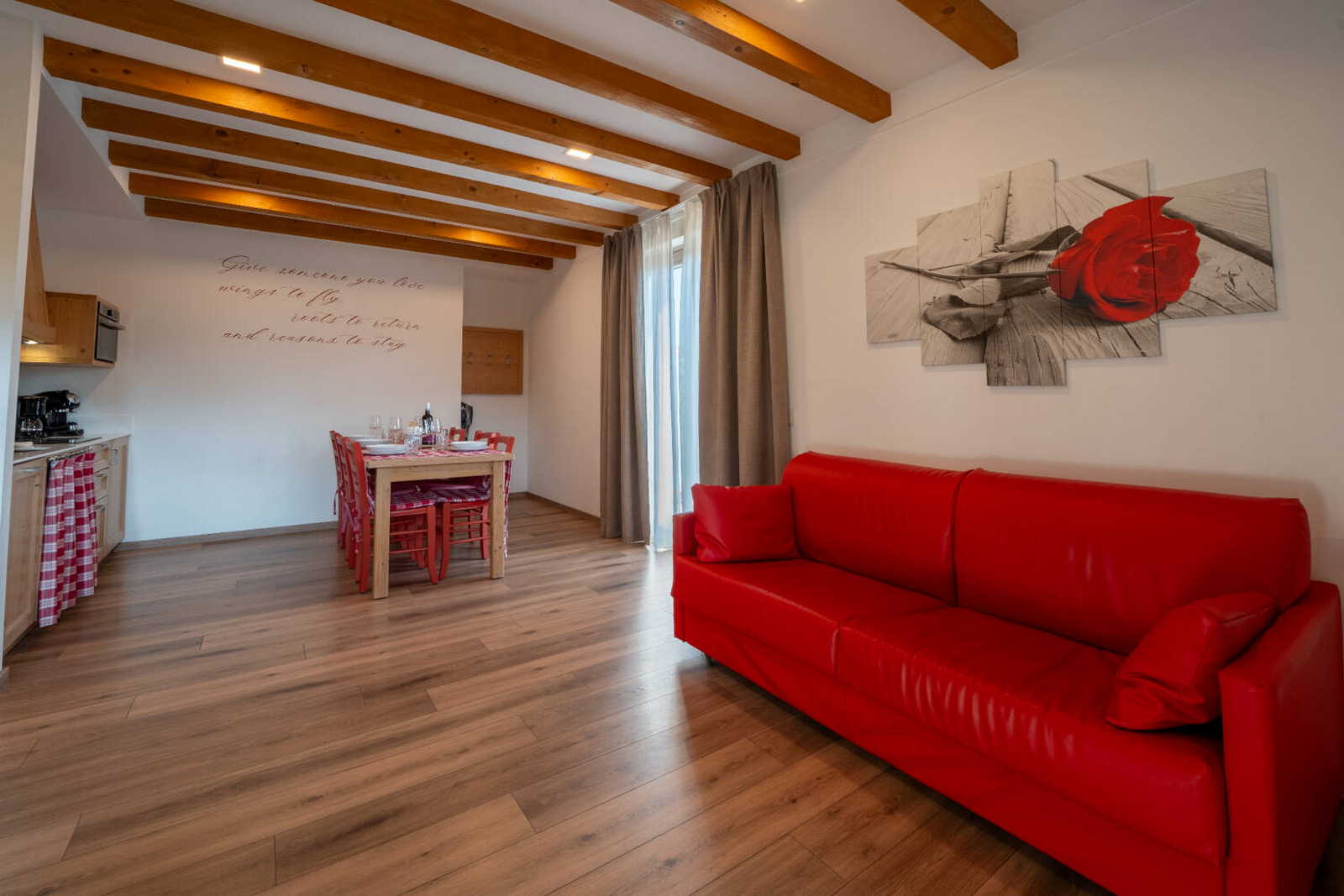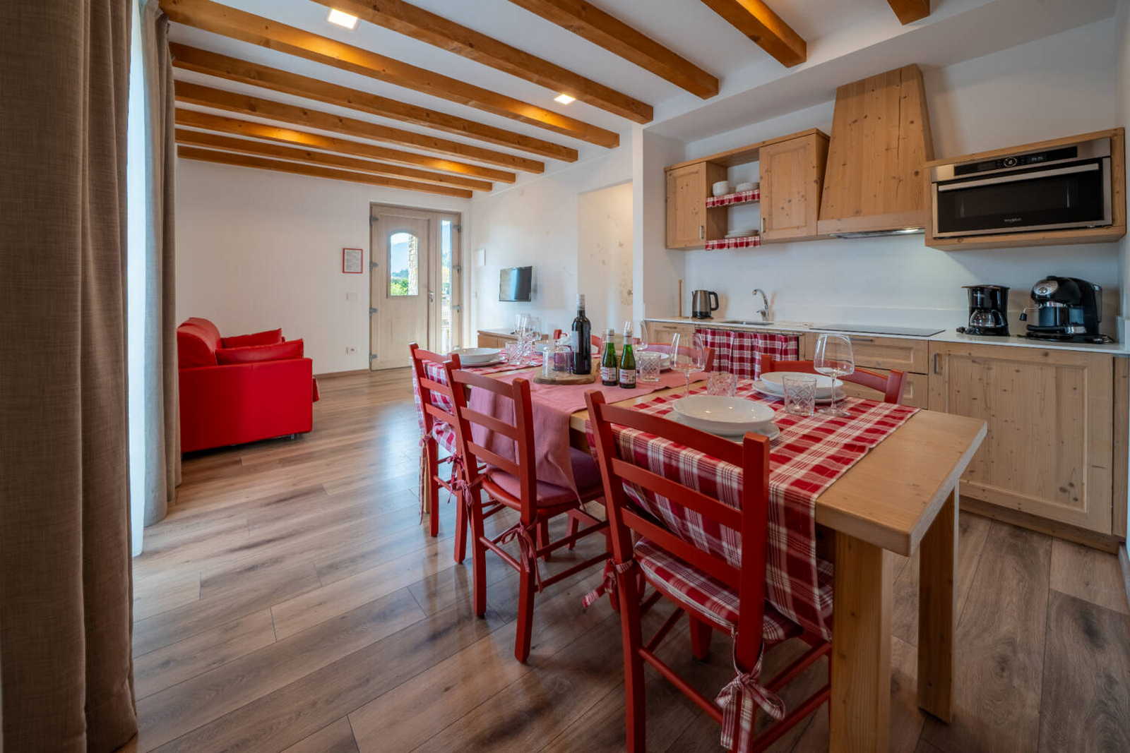 Apartment with private terrace, separate entrance /-54sqm. The charge of the red colour and the warmth of wood become a cuddle for those enjoying this environment. The apartment consists of a large living room with kitchenette and sofa bed, 1 double bedroom, 1 bedroom with bunk beds and a large bathroom with shower.