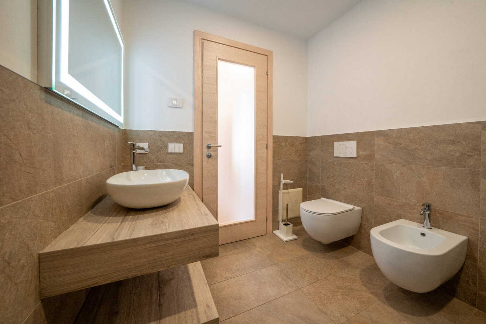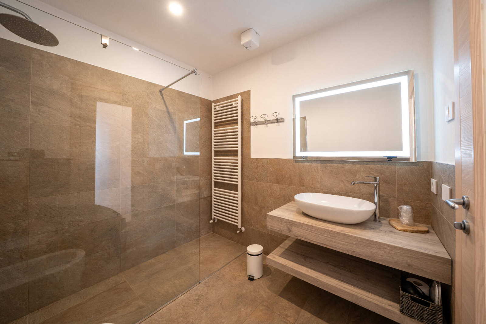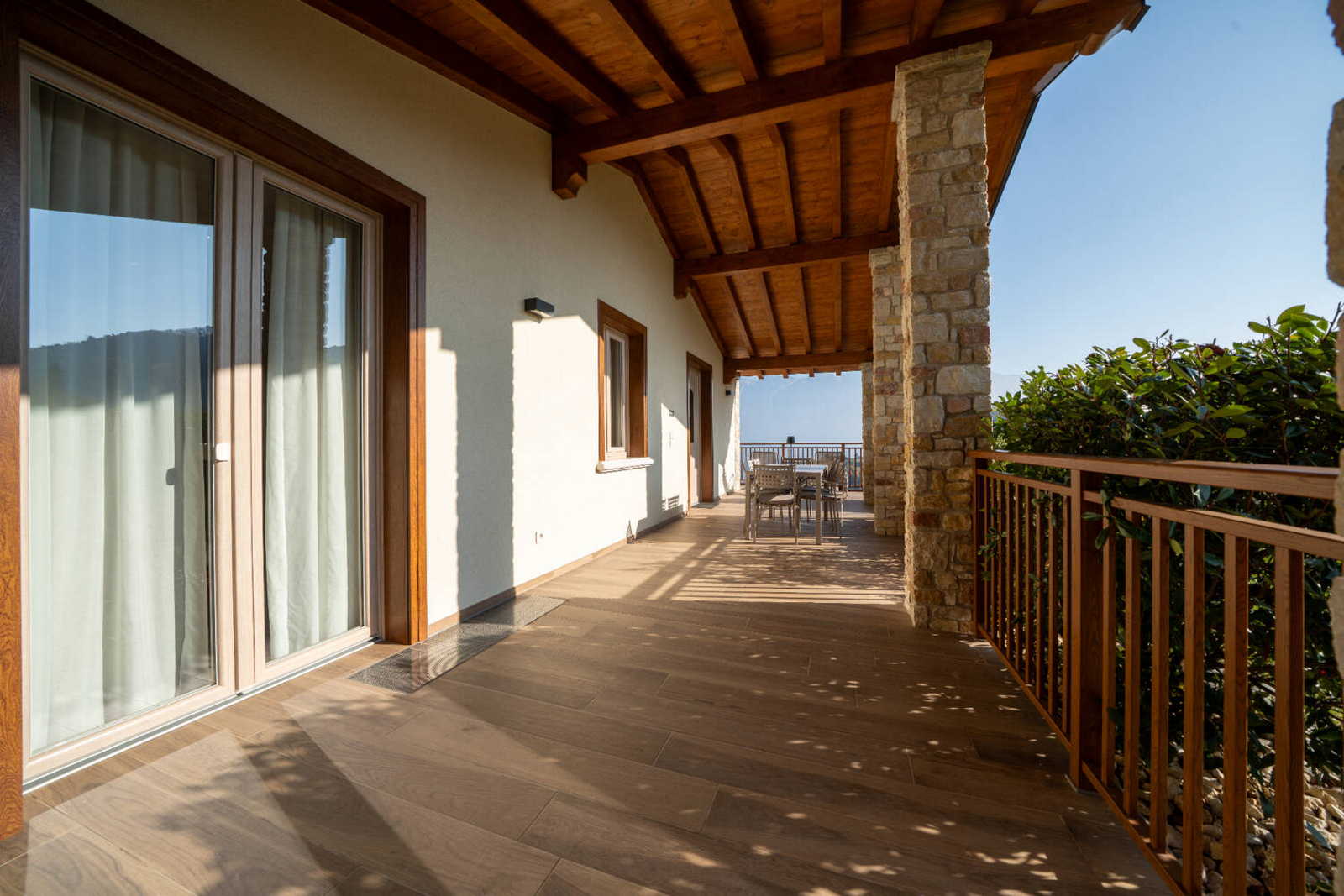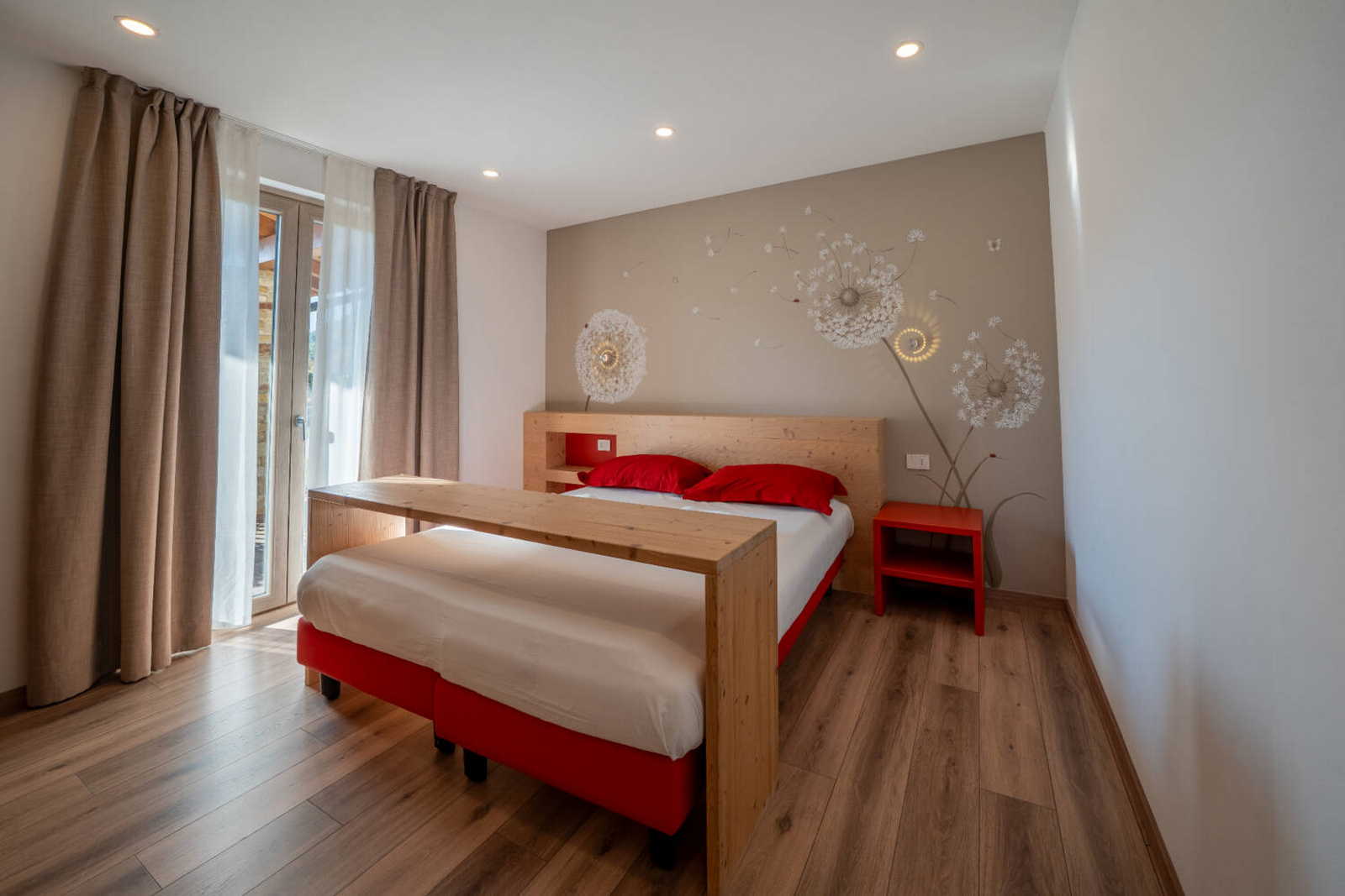 Apartment with private terrace, separate entrance /-54sqm. The charge of the red colour and the warmth of wood become a cuddle for those enjoying this environment. The apartment consists of a large living room with kitchenette and sofa bed, 1 double bedroom, 1 bedroom with bunk beds and a large bathroom with shower.