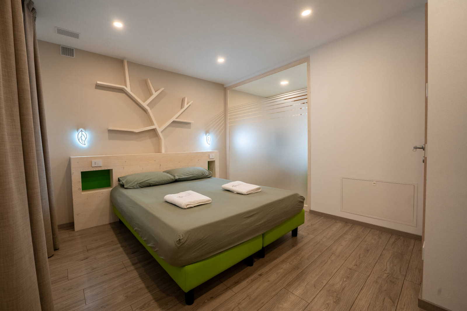 Un rifugio di luce e armonia, dove il bianco puro si intreccia con le delicate venature del legno di abete, creando un’atmosfera accogliente ed elegante. Il verde, filo conduttore degli spazi, richiama la natura e accompagna ogni momento con una sensazione di calma e benessere. Situato al piano terra, l’Appartamento Albero offre ingresso indipendente e una terrazza privata, ideale per rilassarsi all’aperto in totale tranquillità. Con i suoi 50 mq, è la scelta perfetta per chi desidera comfort, intimità e uno stile essenziale ma ricercato.